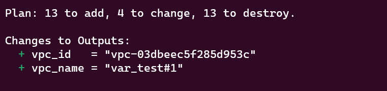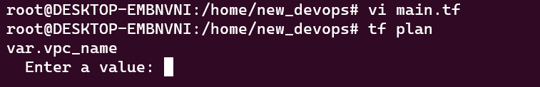 - variable 블록 선언 후, 해당 변수를 "vpc" 모듈의 "name" 변수에 적용한다. variable 블록은 변수 값이 필요하지 않으며 apply 과정에서 물어본다.