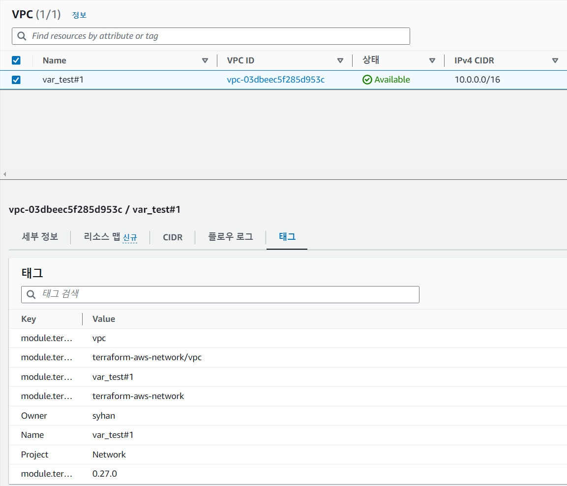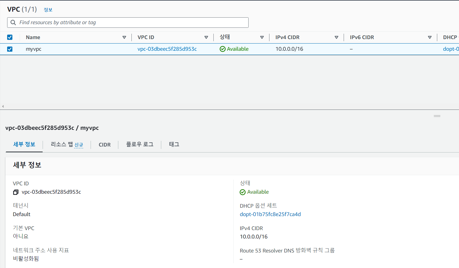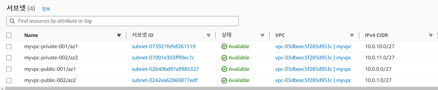 - VPC이름과 CIDR블록이 코드와 동일하게 생성된 것을 확인할 수 있고, 서브넷도 잘 생성된 것을 볼 수 있다.