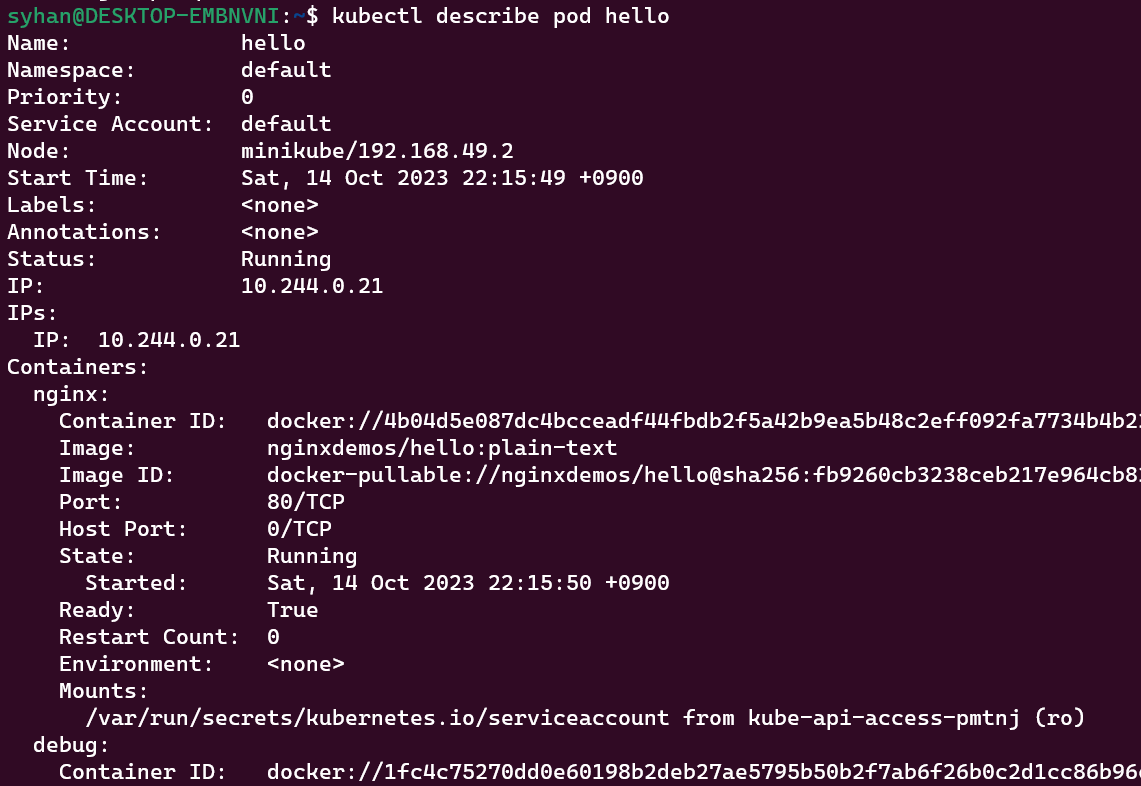 - get pod에서 "READY" 컬럼은 총 1개의 컨테이너중에서 1개의 컨테이너가 준비되었다는 것을 의미