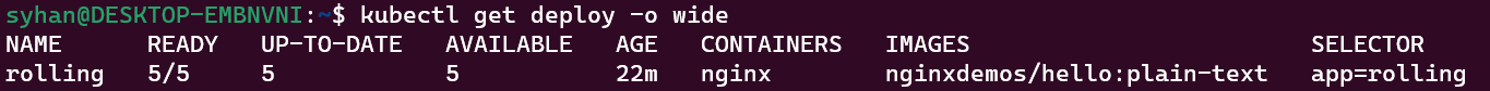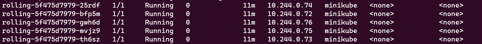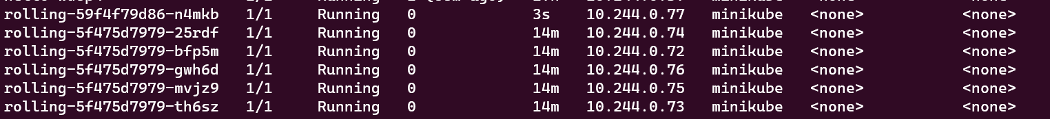 - 그 결과 maxSurge의 값이 1이기 때문에, 업데이트 과정에서 최대 6개(5+1)까지 Pod가 생성되는 것을 볼수있다.