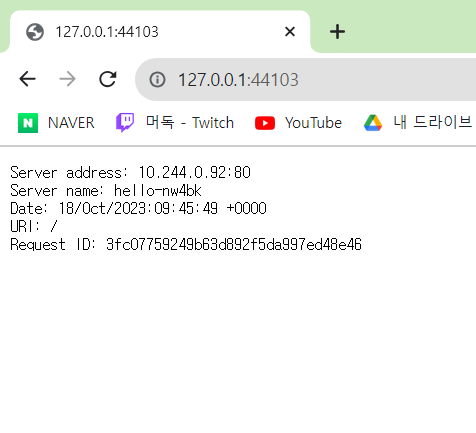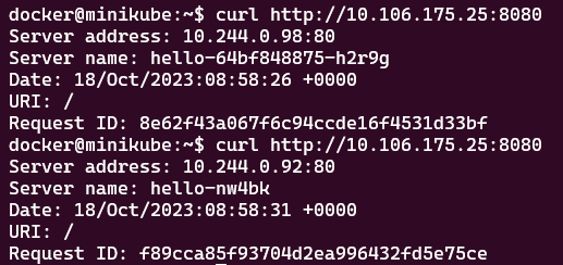 - 클러스터 내부에 들어가서 Cluster IP에 신호를 줄 때마다 LB되기 때문에 대상 Pod가 바뀌는 것을 볼 수 있다.