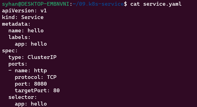 - "spec.ports.port"에는 ClusterIP가 받는 포트가 설정되고, "~targetPort" 에는 LB되는 Pod의 Port가 설정된다.